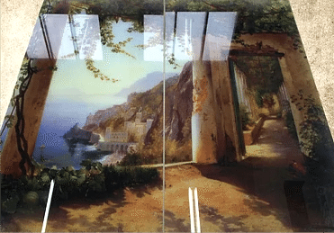 Технология УФпечати по зеркалу схожа на технологию печати на стекле - используются специальные чернила и ультрафиолет, который практически моментально запечатывает рисунок на материале. Картинка получается яркой, детальной и качественной.